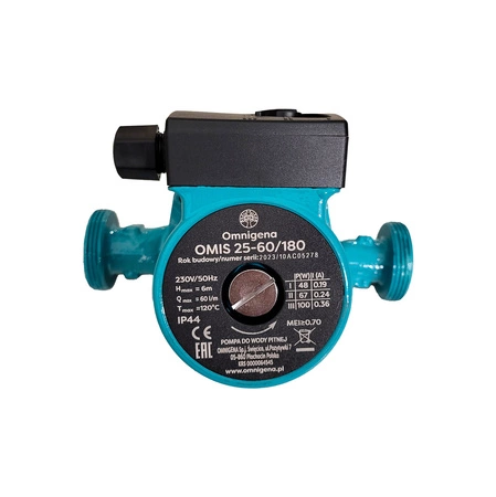 - OMNIGENA Umwälzpumpe Omis 25-60/180 für Heizsysteme. Max. Durchfluss 60 l/min, Förderhöhe 6 m. Für Temperaturen von 5–120°C. Gehäuse aus Gusseisen, Laufrad PPS, Keramikwelle. Schutzart IP 44, max. Druck 10 bar.